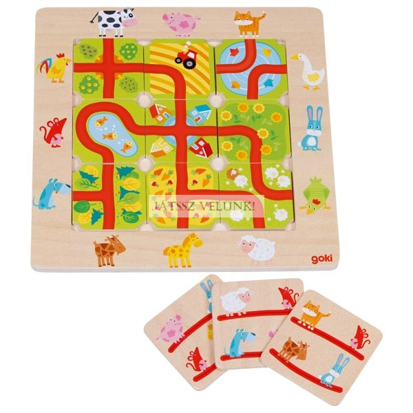 Tizenkét egészen különböző állat él a kis falu közelében. Nagyon szeretik egymást, de csak nagyon ritkán látják egymást. Az ösvények gyakran lehetetlenné teszik számukra, hogy meglátogassák egymást. Segítened kell az állatoknak, hogy gyakrabban látogassák egymást, és új ösvényeket kell építened nekik a mezőkön és réteken keresztül. A „Találd meg az utat” kirakós játék egy fakeretből, 9 kirakós darabból és 20 sablon táblából áll. A „Találd meg az utat” egy trükkös verseny két játékos számára, de egyedül is nagyon szórakoztató játszani, és mindig új útvonalkombinációkat tesz lehetővé. Ez egy igazán különleges kirakós játék, mert rengeteg lehetséges megoldás van benne. A 4 éves kortól kezdődő gyerekek imádni fogják játszani.