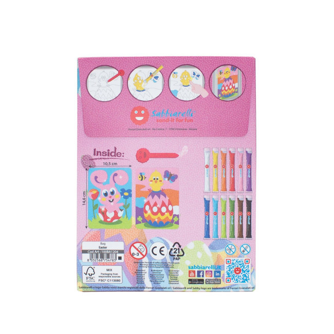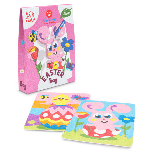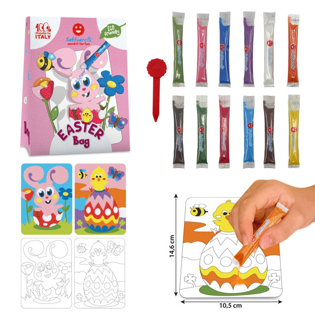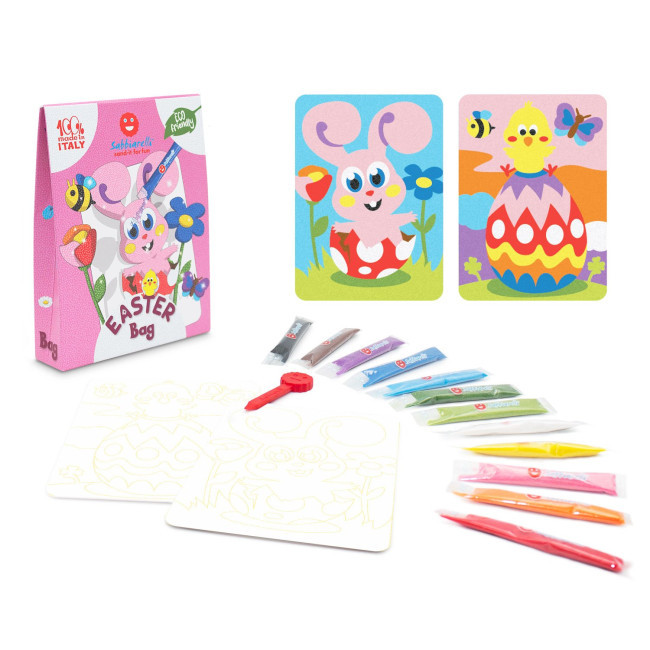 A Sabbiarelli bemutatja a vadonatúj Bag Sabbiarellit, a mini homokfestő készleteket 12 tasak színes homokkal és sok különböző témával, amelyeket homokfestési technikával lehet kiszínezni. Minden táska 2 db matrica mintát, egy hámozót és 12 csomag csillogó homokot tartalmaz.