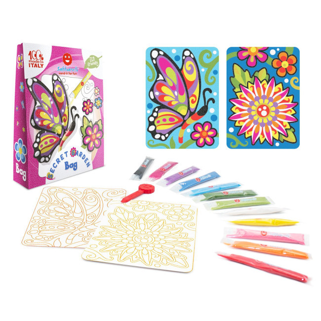 A Sabbiarelli bemutatja a vadonatúj Bag Sabbiarellit, a mini homokfestő készleteket 12 tasak színes homokkal és sok különböző témával, amelyeket homokfestési technikával lehet kiszínezni. Minden táska 2 db matrica mintát, egy hámozót és 12 csomag csillogó homokot tartalmaz.