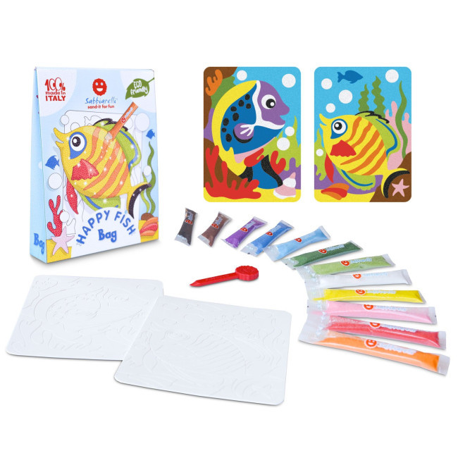 A Sabbiarelli "Happy Fish" táska 2 vidám kishalat ábrázoló matrica rajzot, hámozót és 12 tasak csillogó márványhomokot tartalmaz, vízbázisú, nem mérgező és környezetbarát pigmentekkel színezve. Ez a mini készlet, amely egy FSC® tanúsítvánnyal rendelkező merev kartonzacskóban található, tökéletes megoldást jelent azok számára, akik szeretnének megismerkedni a homokfestés játékával és kipróbálni, mielőtt tollakat vásárolnának. A játékalap elkészítéséhez egy cipősdoboz fedelét, vagy akár csak egy A4-es lap használatát javasoljuk. Miután a két rajz közül az egyik felkerült erre a játékalapra, a hámozó segít eltávolítani a rajz azon darabjait, amelyeket azonos színűre szeretnél színezni, a játékdobozon feltüntetett színezési javaslatokat követve, vagy szabadon választva. Ekkor nyissuk ki a kívánt színű tasakot a tépést megkönnyítő sraffozást követve, és a speciális horonynak köszönhetően könnyedén öntsük rá a homokot a minta tapadó részeire, ujjainkkal rögzítve. Végül rázd le a felesleges homokot, amelyet edénybe gyűjthetsz, vagy felhasználhatsz más kreatív barkácsprojektekhez. Így járunk el, egy-egy színben, amíg a teljes rajz kiszíneződik. A végén két csillogó képet kapsz tengeri halakról, amelyek készen állnak akasztani, ajándékba vagy eredeti üdvözlőlapként. Eredeti gyermeki kézműves alkotás, amellyel egy kreativitásnak szentelt délutánt szórakoztatóan és játékosan tölthet el, miközben elősegíti a finommotorika, a figyelem és koncentráló képesség fejlesztését.