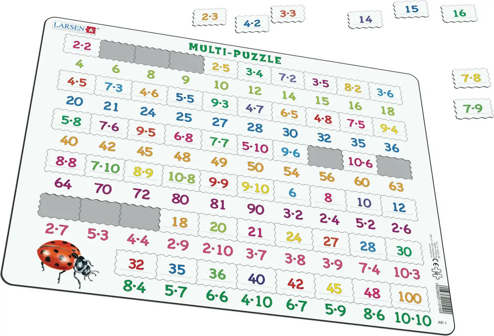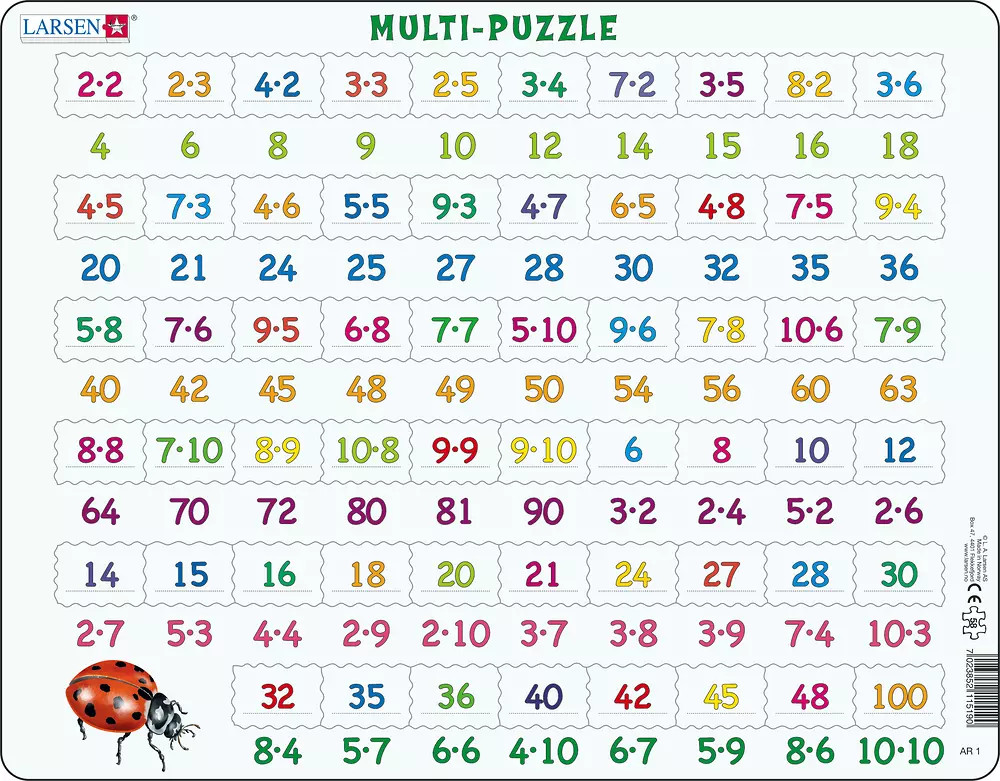 Játssz egy kis „matekozást” ezzel az oktató jellegű szorzótáblás kirakóval. Ebben a kirakóban minden darabon 36 „feladat” található. A válaszok a keretre, közvetlenül alá vannak nyomtatva. Minden szám és feladat élénk, neon színekkel van nyomtatva, hogy felkeltse a kirakós figyelmét. A keret bal alsó sarkában egy nagy pöttyös katicabogár illusztráció található. A kirakó 58 ívelt szélű darabot tartalmaz. A kirakó alsó felén található a fennmaradó 22 darab, rajtuk a válaszokkal vagy számokkal, amelyek a keretre nyomtatott „feladathoz” kapcsolódnak. Minden kirakódarab egyedileg van kivágva, hogy a tálcában a megfelelő helyre illeszkedjen. Ez a kirakó leginkább a kissé idősebb, szorzást tanuló gyermekek számára alkalmas.