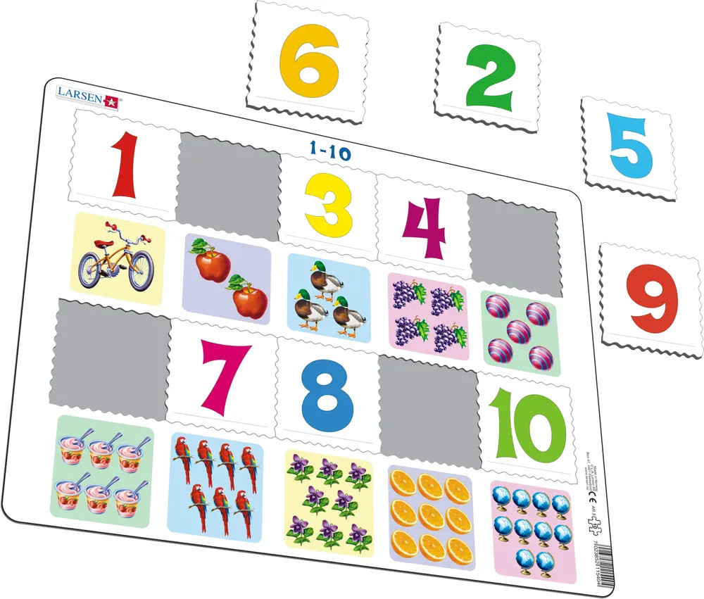 „Egy sárga bicikli, két piros alma, három civakodó kacsa, készen a megküzdésre. Négy lédús szőlő és öt pattogó labda, fel-le járkálva, majd a földre hullva. Hat krémes joghurt, 7 csevegős papagáj, 8 lila virág, de narancssárga répa nincs! Van viszont 9 narancssárga gyümölcs, 10 világméretű földgömb, pont elég nekem és neked!” Ez az alapvető számkirakó ösztönzi és elősegíti a számfelismerést. Minden kirakódarab gondosan egy számmal van ellátva. A számot ábrázoló illusztráció a kereten keresztül, közvetlenül a felső sor alatt látható. A számok élénk, szemet gyönyörködtető színekben jelennek meg, ívelt széllel. Ez a kirakó 10 ívelt szélű darabból áll, amelyek leginkább a kisebb gyermekek számára alkalmasak, akik 1-től 10-ig tanulják a számokat.