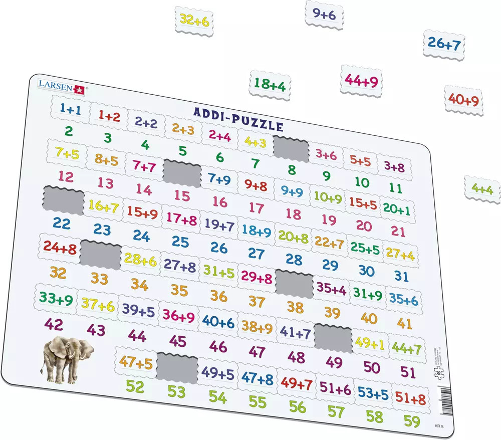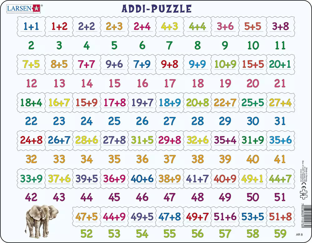Ez a tanulást segítő matematikai kirakós segít a gyerekeknek megtanulni 59-ig számolni. A gyerekek rengeteg szórakozást fognak nyújtani az egyes kirakódarabok feladatainak megoldása során. Ebben a kirakóban 58 feladat és lekerekített szélű darab található, amelyek a keretben a megfelelő helyre illeszkednek. A számok vastag, szemet gyönyörködtető színekkel vannak írva, hogy felkeltsék a kirakós figyelmét. A bal alsó sarokban egy elefánt dekoratív képe található, amely művészi elemet ad a kirakónak. Az lekerekített szélű darabok elősegítik mind a kéz-, mind a szem koordinációját, mivel a kirakós leginkább a kicsit idősebb gyermekek számára alkalmas, akik az összeadást tanulják.