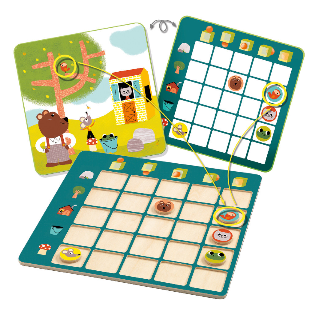 Ez a játék kiválóan fejleszti a relációs szókincset, hiszen a fölötte, alatta, előtte, mögötte, benne relációkat gyakoroltatja veled mátrix rendszerben. Kérdések, mint „Hol van a béka? A házban. És a kismadár? Fent a sziklán.” segítenek a játék során. Térbeli eligazodásodat fejlesztve még szórakoztatóbbá válik az ismeretszerzés.