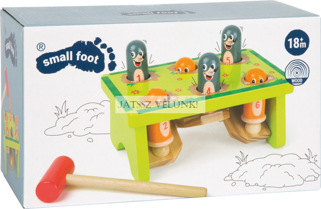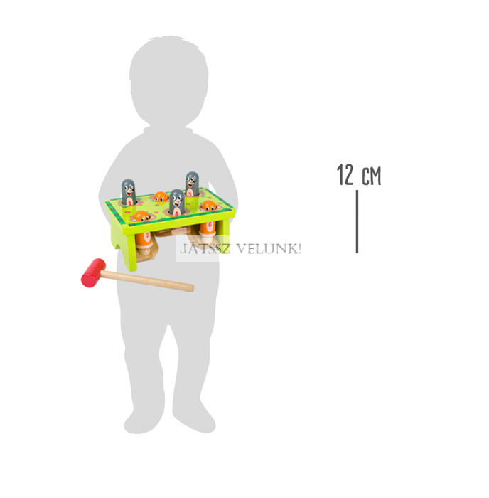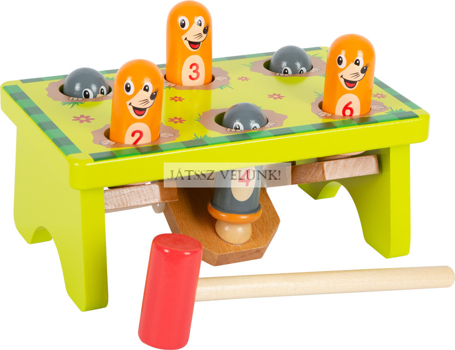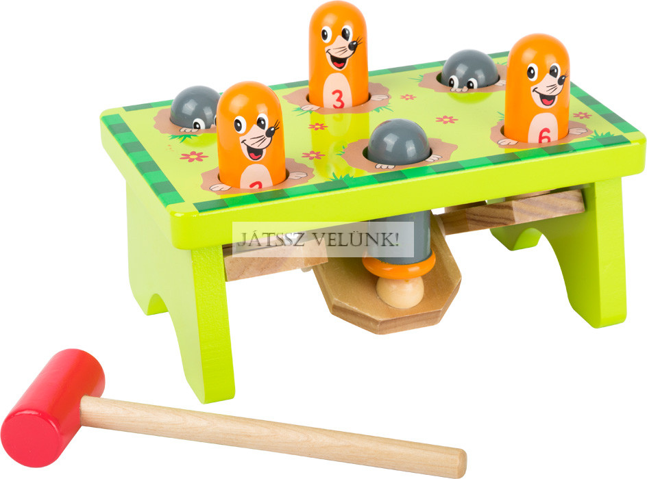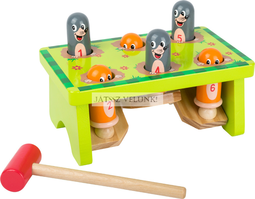 Vakondvadászat a kertben! Ez a szórakoztató kalapácsjáték garantáltan szórakoztat. Minden kalapácsütéssel a vakond fejére egy másik vakond diadalmasan kukucskál ki a földbe ásott lyukából. A számozott üregekkel elősegíthető a számfelismerés, a kalapálás pedig nem mellesleg a motoros készségeket és a koncentrációt is fejleszti.