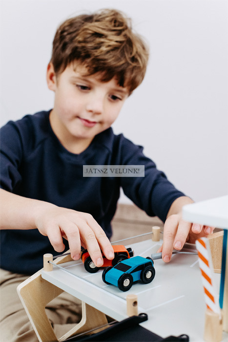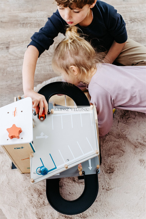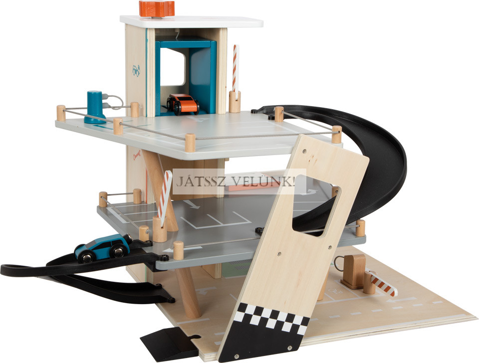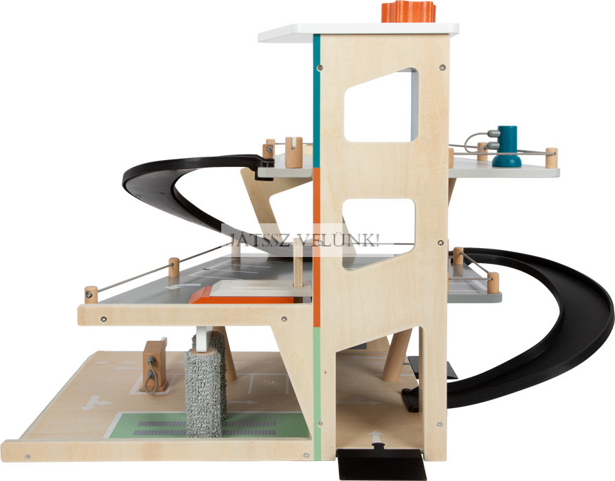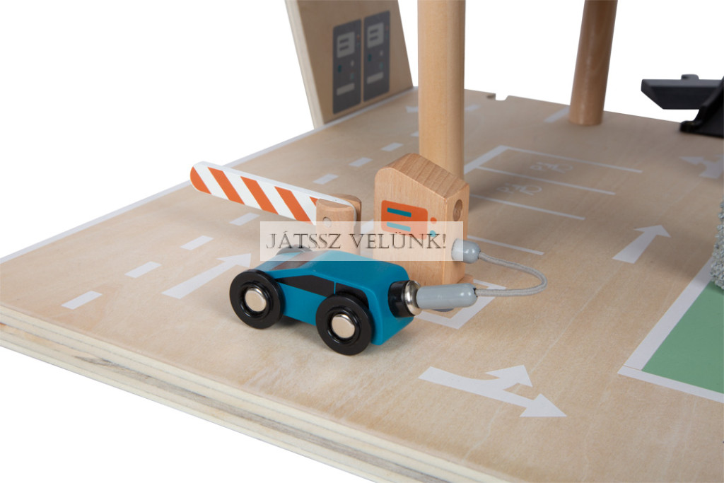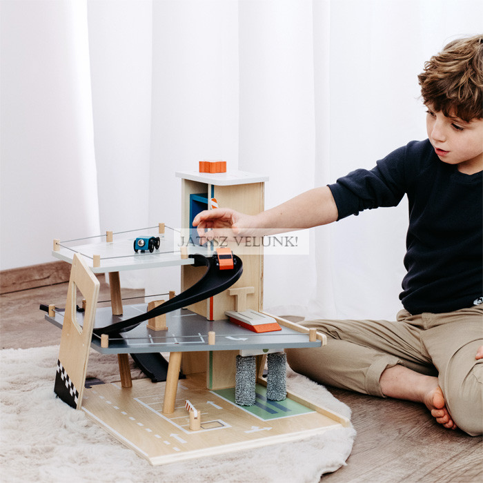 Ez a parkoló csodálatos benyomást kelt a sok látható faanyaggal és a visszafogott, divatos színek modern keverékével, valamint a dinamikus dizájnelemekkel, amelyek hozzájárulnak a rámpákon lefelé haladó autók sebességéhez. A gyártás során a környezeti tényezők figyelembevétele érdekében anyagtakarékos elrendezést választottak, amely elkerüli a gyártás során keletkező hulladékot. Mivel ez a parkoló csatlakozási pontokkal és behajtó rámpákkal rendelkezik, kombinálható a szokásos fa játékvonatokkal vagy kis gyalogos utcai elemekkel, és így integrálható a meglévő játékvilágokba. Abszolút fénypontja a játékautó-választéknak!