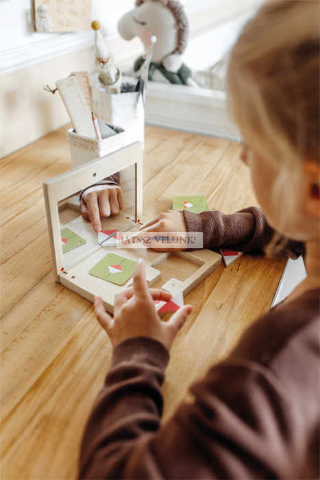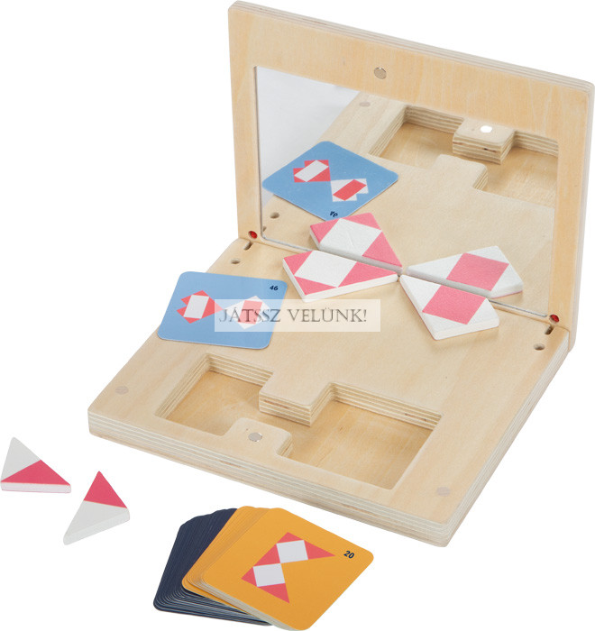 Fedezd fel a tükröződéseket és a szimmetriát szórakoztató módon! Ez a lenyűgöző kirakós játék egy praktikus fadobozban lehetőséget kínál a szimmetrikus alakzatok felfedezésére és a geometriai alakzatok kutatására. A gyerekbarát tükör tangram játék célja, hogy a formázott lapokat a nagy, törhetetlen tükör elé helyezd úgy, hogy a lapok és azok tükörképei megegyezzenek a sablonkártyán lévő képekkel. A 32 kétoldalas sablonkártya változó és egyre nehezebb kirakós játékokat kínál. A praktikus mágneses zárnak és kompakt méretének köszönhetően a játékdoboz minden iskolatáskába elfér, és ideális társ és időtöltés kirándulásokon is.