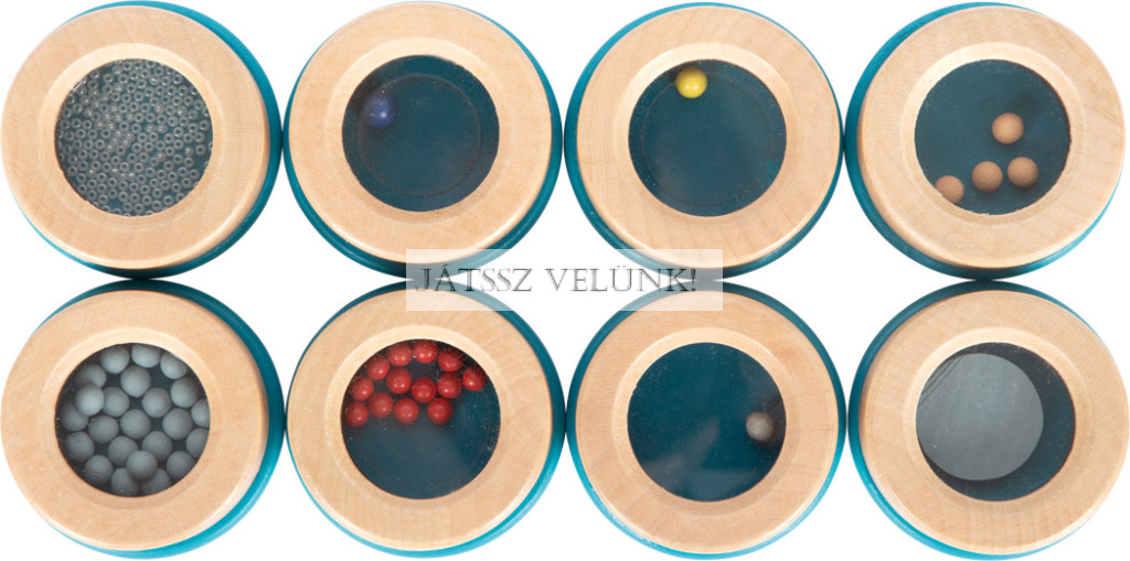 • A dobozok különféle tárgyakkal, például fapénzekkel vagy műanyag gyöngyökkel vannak tele, és a tartalmuk különböző színű a vizuális játékhoz.