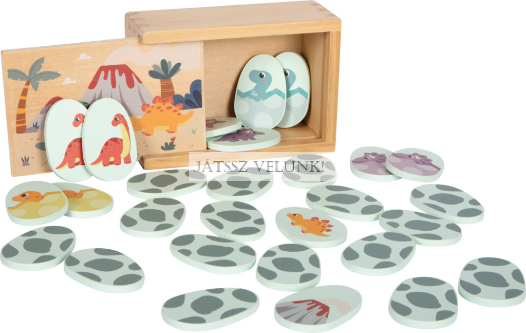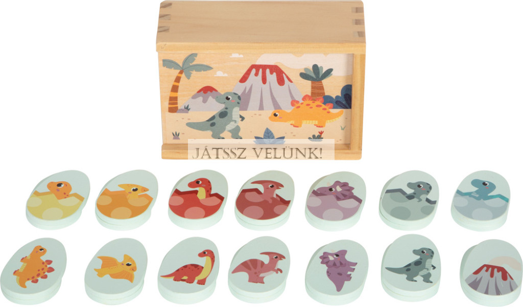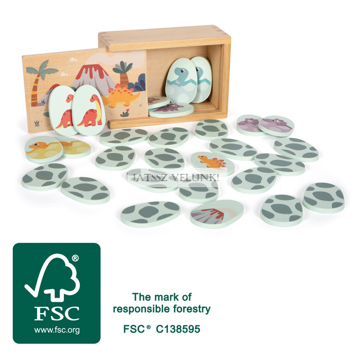 Memóriajáték szórakozás fiatal dínó rajongóknak! Ezzel a 100%-ban FSC® tanúsítvánnyal rendelkező fából készült memóriajátékkal a játékosoknak koncentrációra és memóriakészségre lesz szükségük a 14 egyező képpár megtalálásához. A falapok gyermekbarát dizájnnal rendelkeznek, dinoszaurusz tojások formájában, aranyos dinoszaurusz motívumokkal, amelyek lehetővé teszik a gyerekek számára, hogy elmerüljenek az őskori kor kalandos világában. A kisgyermekek nemcsak a koncentrációjukat és a memóriájukat fejlesztik, hanem megismertetik őket a bolygónkon egykor élő különféle dinoszauruszokkal is.