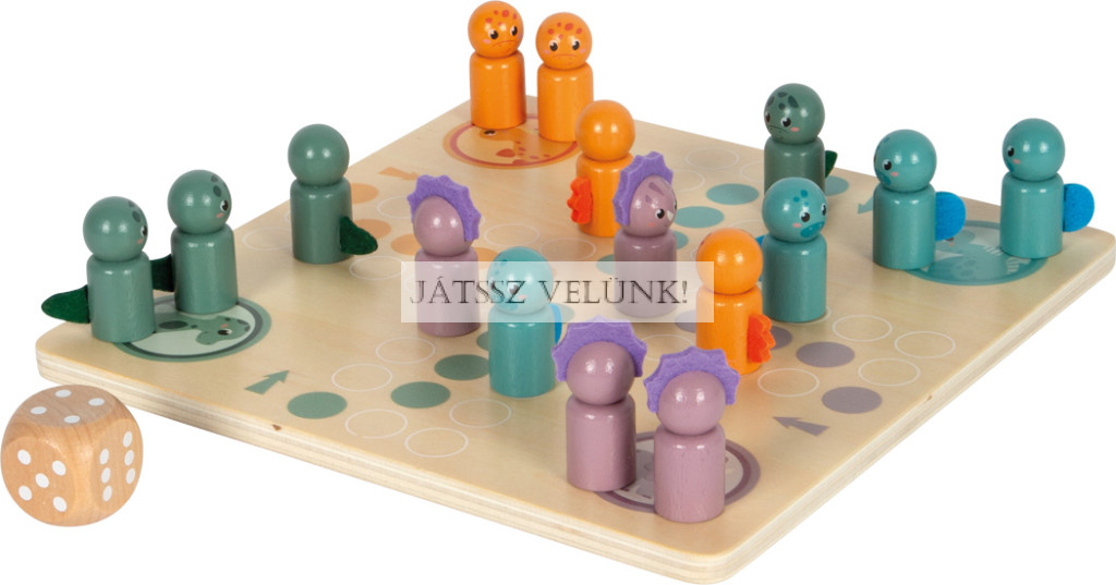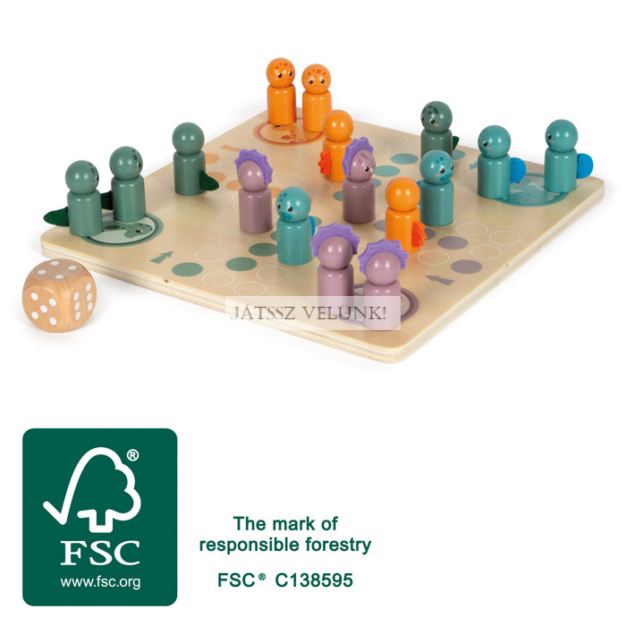 Hatalmas Ludo móka a fiatal dínórajongóknak! Ezzel a 100%-ban FSC® tanúsítvánnyal rendelkező fából készült Ludo játékkal a cél az, hogy elsőként vidd be a dinoszauruszaidat a kis kunyhóba. Az extra nagy dobókockák jelzik, hogy hány mezőt tud előrelépni a játékfigurád. A dinoszauruszos játékfigurák fából és filcből készültek, és realisztikus, gyerekbarát dizájnnal rendelkeznek.