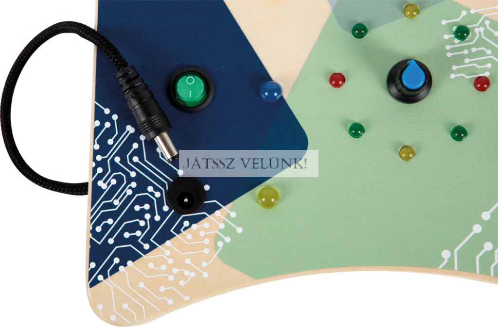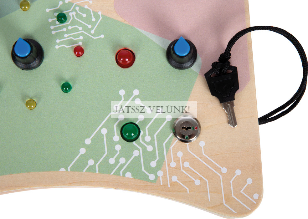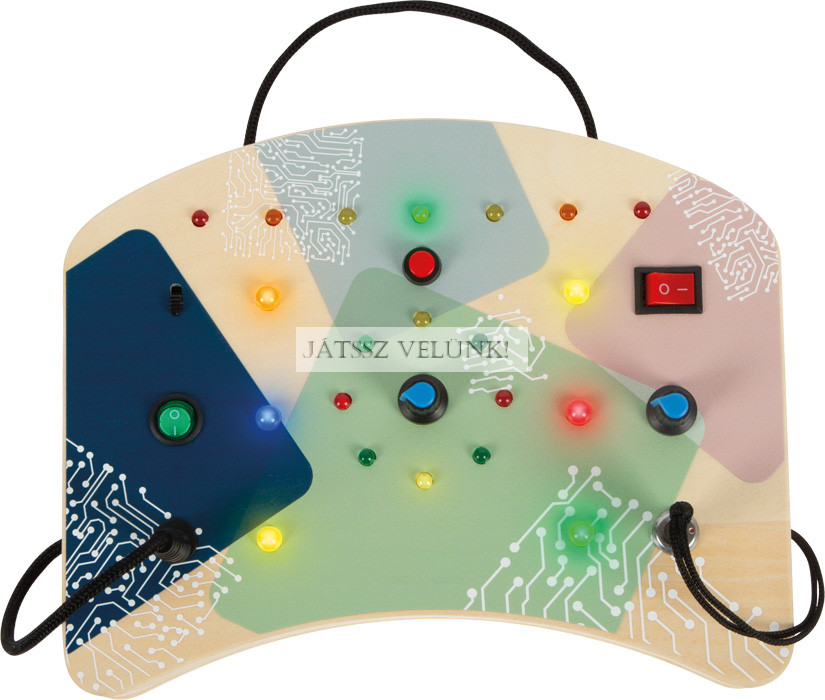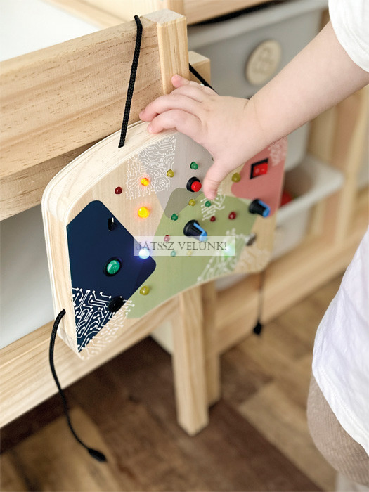 Fiatal felfedezőknek! A kiváló minőségű fából készült Motoros Aktivitás Tábla LED lámpákkal és kapcsolókkal egy lenyűgöző tanulójáték, amelyet kifejezetten a kisgyermekek kreativitásának ösztönzésére és motoros készségeik fejlesztésére fejlesztettek ki. Számos interaktív elemmel ez az elektronikus foglalkoztató tábla izgalmas lehetőséget kínál arra, hogy szórakoztató módon fedezzük fel az elektronika világát elektronikus kapcsolók és gombok segítségével. A tábla különféle gombokkal, forgógombokkal, billenőkapcsolókkal, gyújtáskulccsal és csatlakozódugóval van felszerelve. Ezek lehetővé teszik a gyerekek számára, hogy megismerkedjenek a leggyakoribb kapcsolótípusokkal. A felső piros gomb egy lenyűgöző LED-es fénysorozatot aktivál, amely kísérletezésre ösztönzi a gyerekeket. A középső kék gombbal szabályozhatják a LED-lámpák körkörös felvillanásának sebességét.