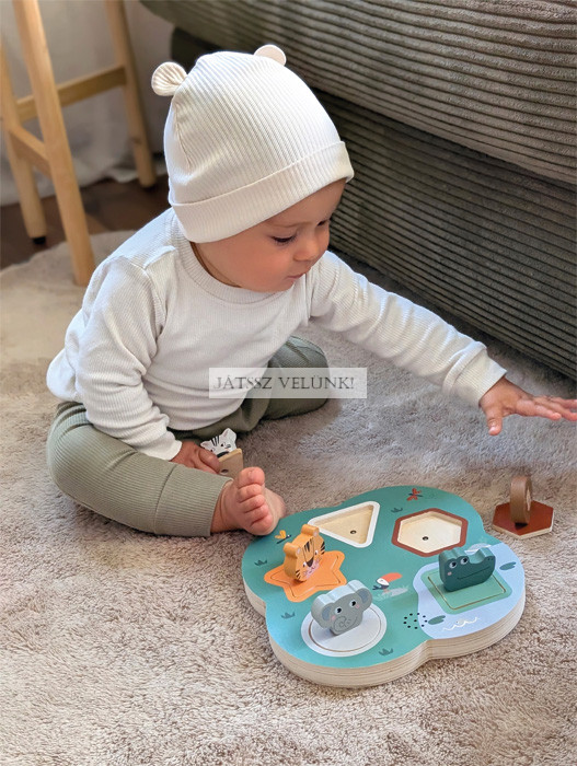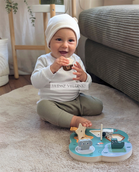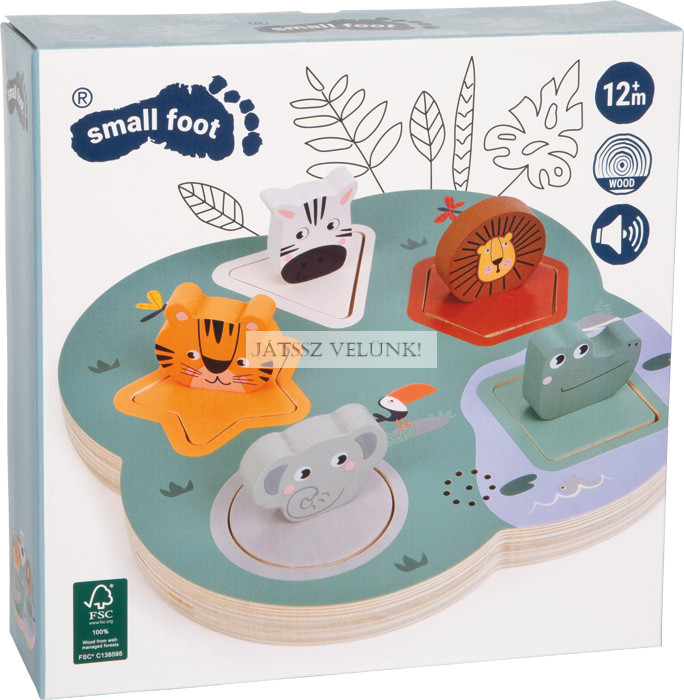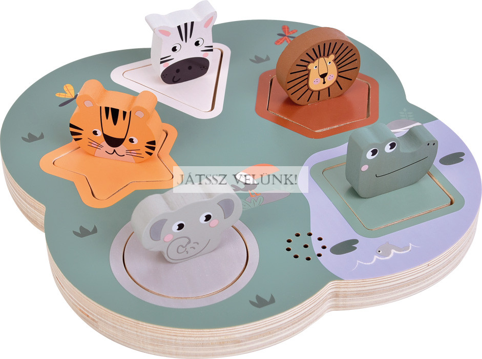 Vad fejtörő móka hangeffektekkel! Az FSC® 100%-ban tanúsított fából készült 3D „Safari” kirakóval a gyerekek játékosan fedezhetik fel a szafari állatok és hangjaik világát. Öt szeretettel illusztrált, elefánt, zebra, oroszlán, tigris és krokodil alakú kirakódarab könnyen beilleszthető a megfelelő nyílásokba a könnyen megfogható állatfejeknek köszönhetően - amikor felemelik őket, a hozzá illő állathang hallható! A kirakódarabok nem csak állatfigurák, hanem alapvető geometriai alakzatokkal is rendelkeznek, mint például háromszögek, körök, négyzetek, csillagok és hatszögek. Így a gyerekek megtanulják felismerni és rendszerezni a formákat, valamint az állathangokat. A nagy, könnyen megfogható darabok és a hozzá illő kivágások még a legkisebbek számára is megkönnyítik a kirakós játékot.