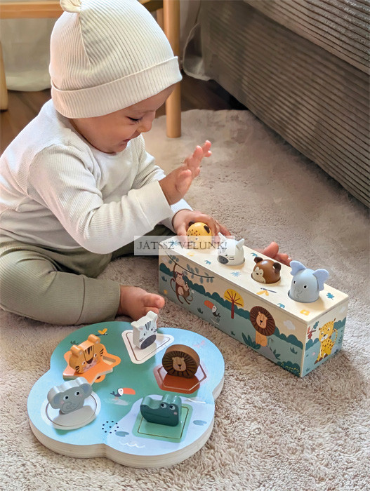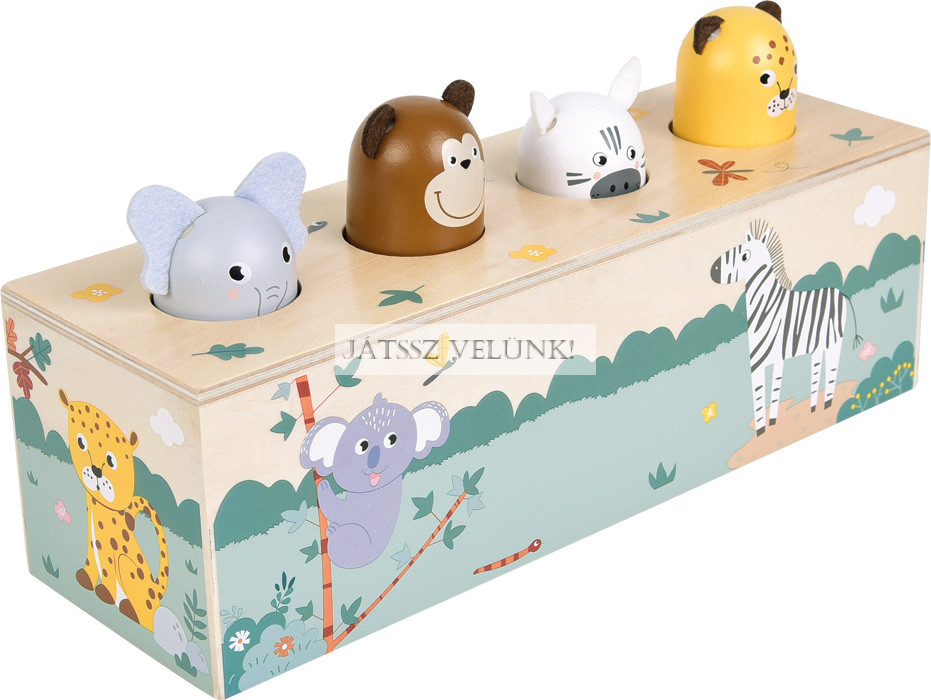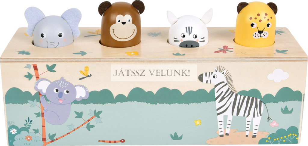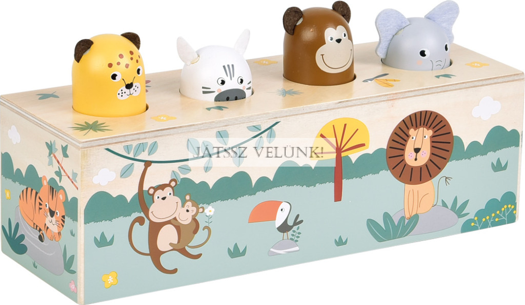 Állatos móka tanulási hatással! Ez az interaktív, 100%-ban FSC® tanúsítvánnyal rendelkező fából készült játék négy népszerű szafari állatot hoz mozgásba – valósághű állathangok kíséretében, mivel az állat megnyomása a hozzá tartozó állathangot adja ki. Ez egy szórakoztató módja annak, hogy a fiatal felfedezők megismerkedjenek a különböző állathangokkal és az ok-okozati elvvel, miközben fejlesztik motoros és kognitív képességeiket.